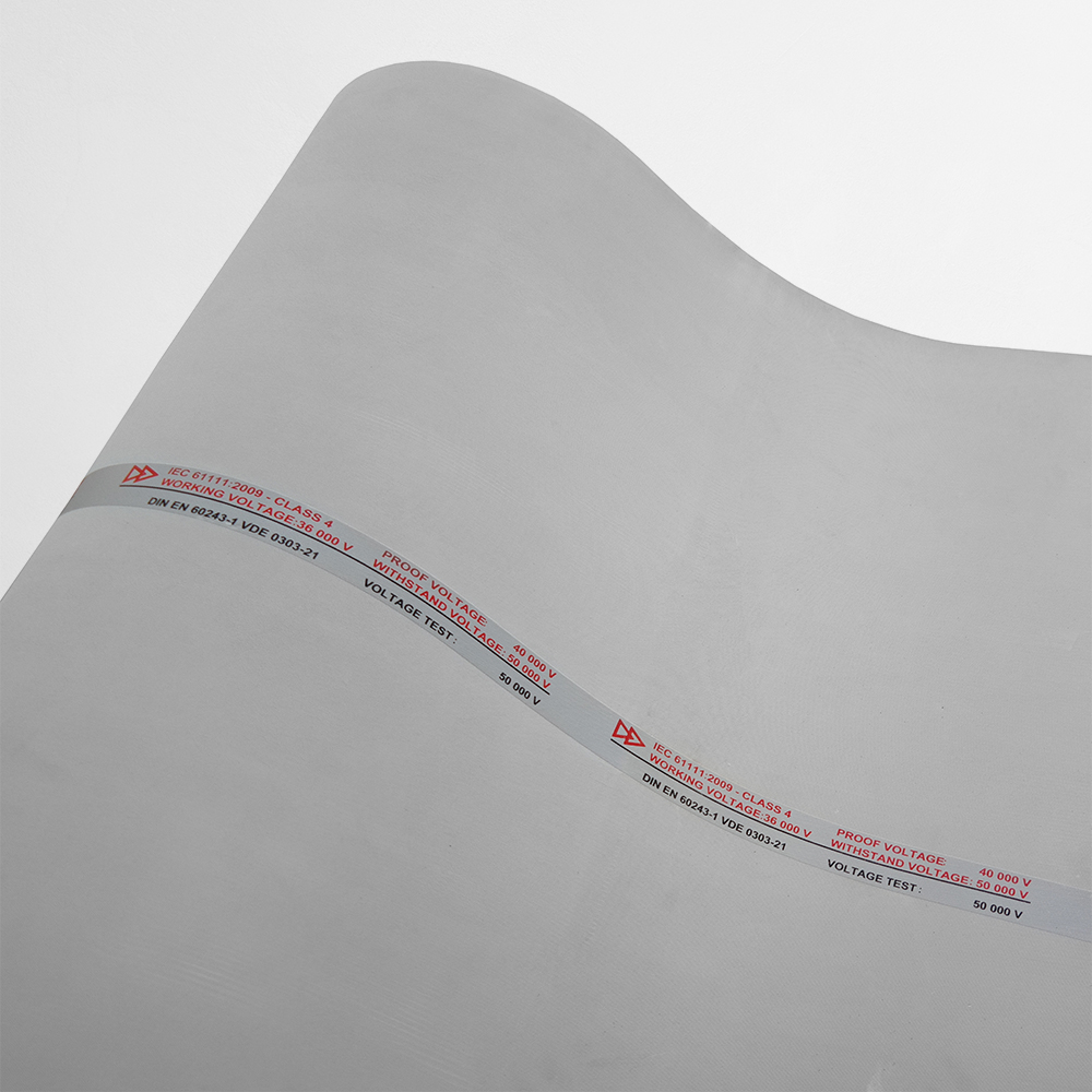 Comes with Test Certificate up to 50kV. High grade rubber compound grey electrical insulation safety matting, tested and stamped to IEC 61111 Class 4. Capable of withstanding voltage of 50kV, test voltage of 40kV and working voltage 36kV.